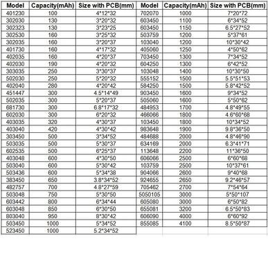 | 502030 | 3.7V | 250mAh | UL/KC/IEC62133/CE/ROHS/UN38.3/MSDS |